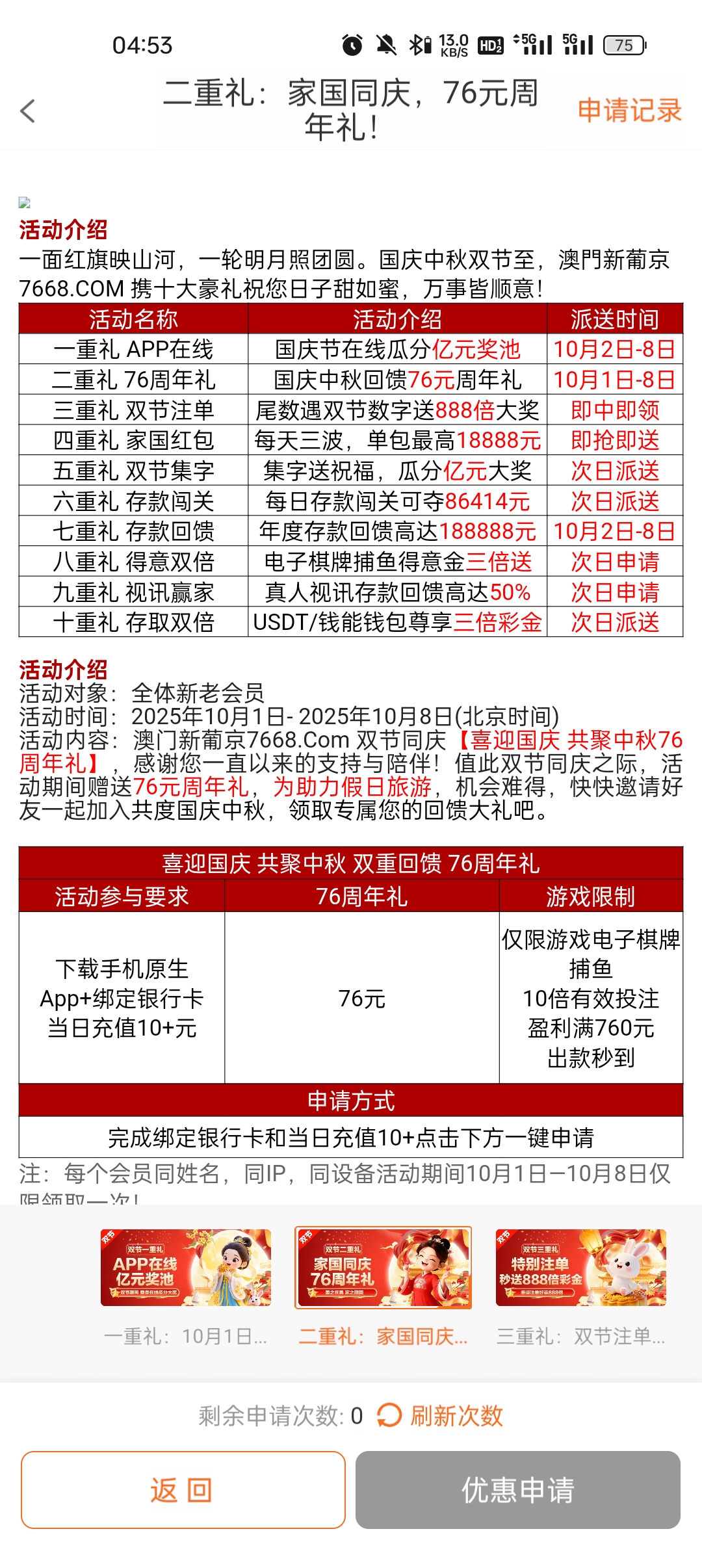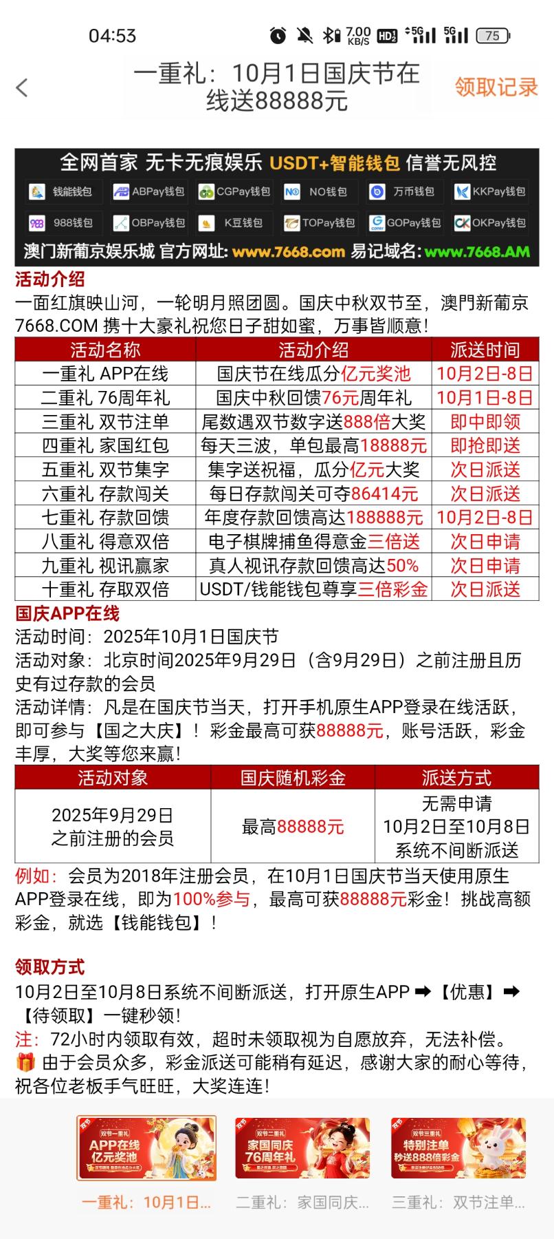 国庆回馈 10.1登录随机彩金 还有充值10送76