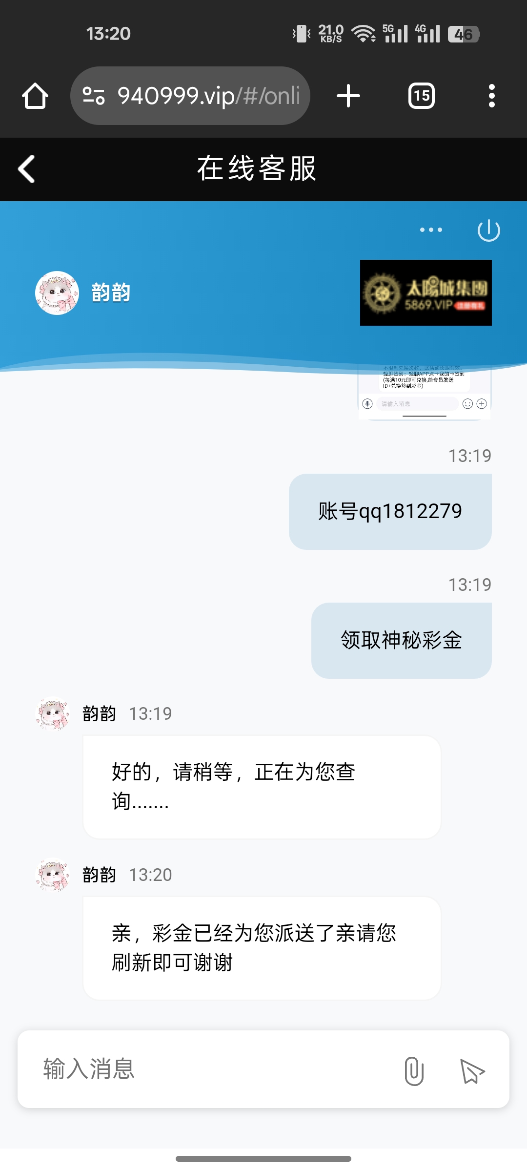 站内信有信息的直接截图发给客服,领取神秘彩金,送的我8,我没充值过老用户去